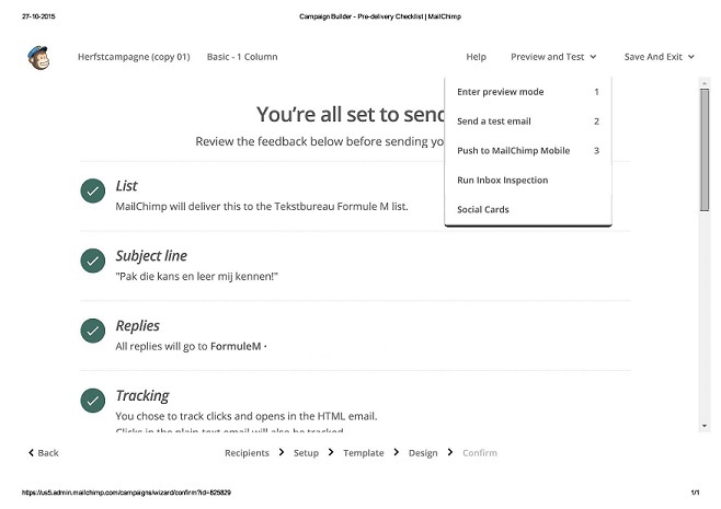 - Dankzij “Preview and Test” kun je na het maken van je nieuwsbrief testen of al je linkjes werken, of de foto’s goed geplaatst en zichtbaar zijn, of je geen taalfouten hebt gemaakt en of je misschien iets vergeten bent te vertellen.